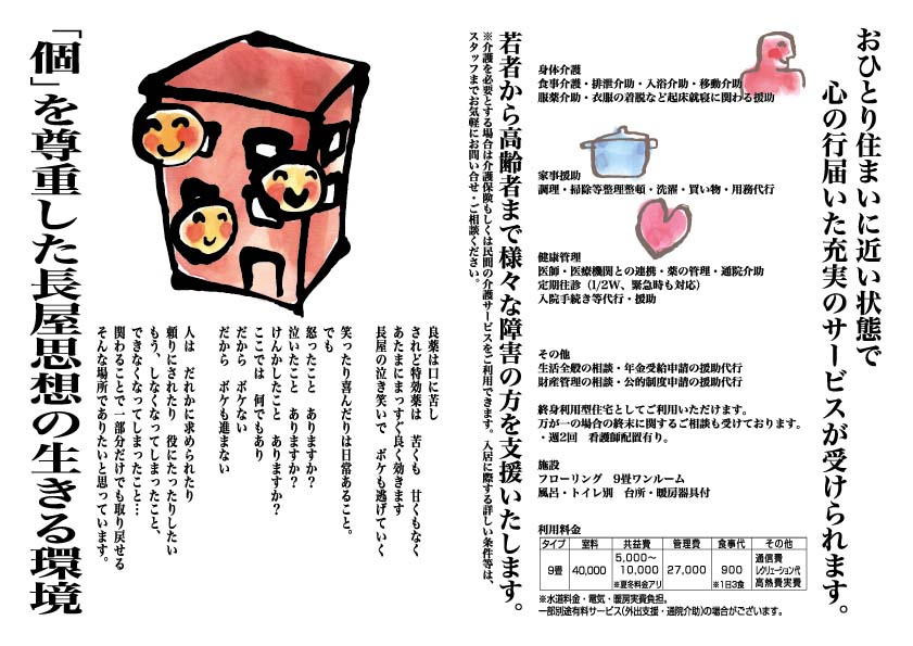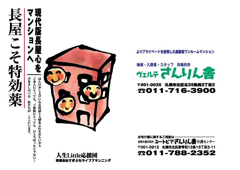 ヴェルテ・さんりん舎は、「長屋スタイル」思想の生きたマンションタイプの共同住宅です。 さんりん舎は、高齢者、要介護者に限定せず、 若い障がい者(知的、精神障がい)の方もお住まいになれます。 要介護3以上もお住まいになれる共同住宅です。認知症が出たからといって退居を求めません。 様々な悩み、まずは、お問い合わせご相談ください。 TOPへ戻る